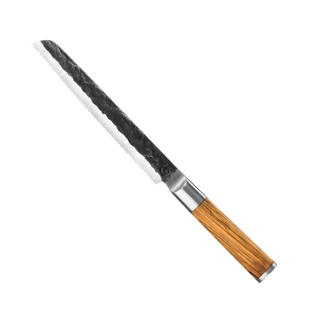 Nôž na chlieb s dĺžkou čepele 20,5 cm so zúbkovaným ostrím pohodlne nakrájate chrumakvé pečivo, torty, zákusky či chlieb. Elegantný a štýlový dizajn, robustné prevedenie, pohodlná rukoväť z olivového dreva. Unikátny a vysoko kvalitný nôž, ktorý je vyrábaný ručne z japonskej ocele. Dodávaný v luxusnej darčekovej krabičke. Perfektný pomocník a dizajnový doplnok do vašej kuchyne.